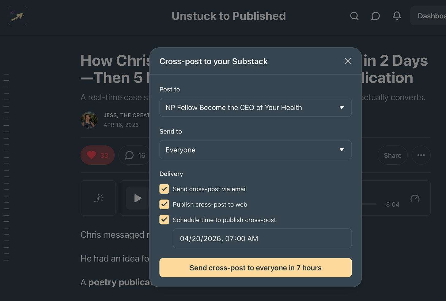 Then, choose your delivery to cross-post, either to your audience’s emails or your publication’s web page, or both.
