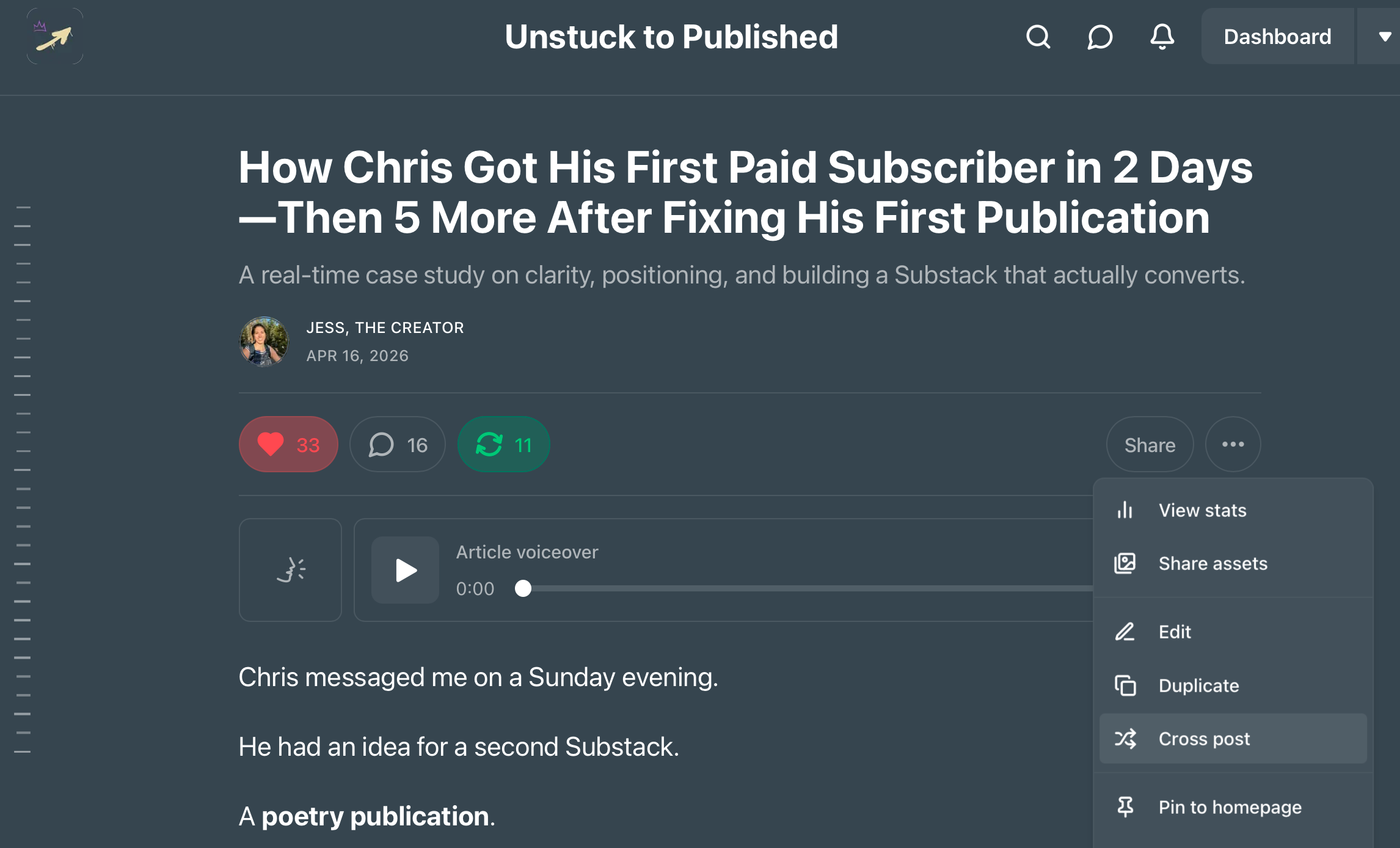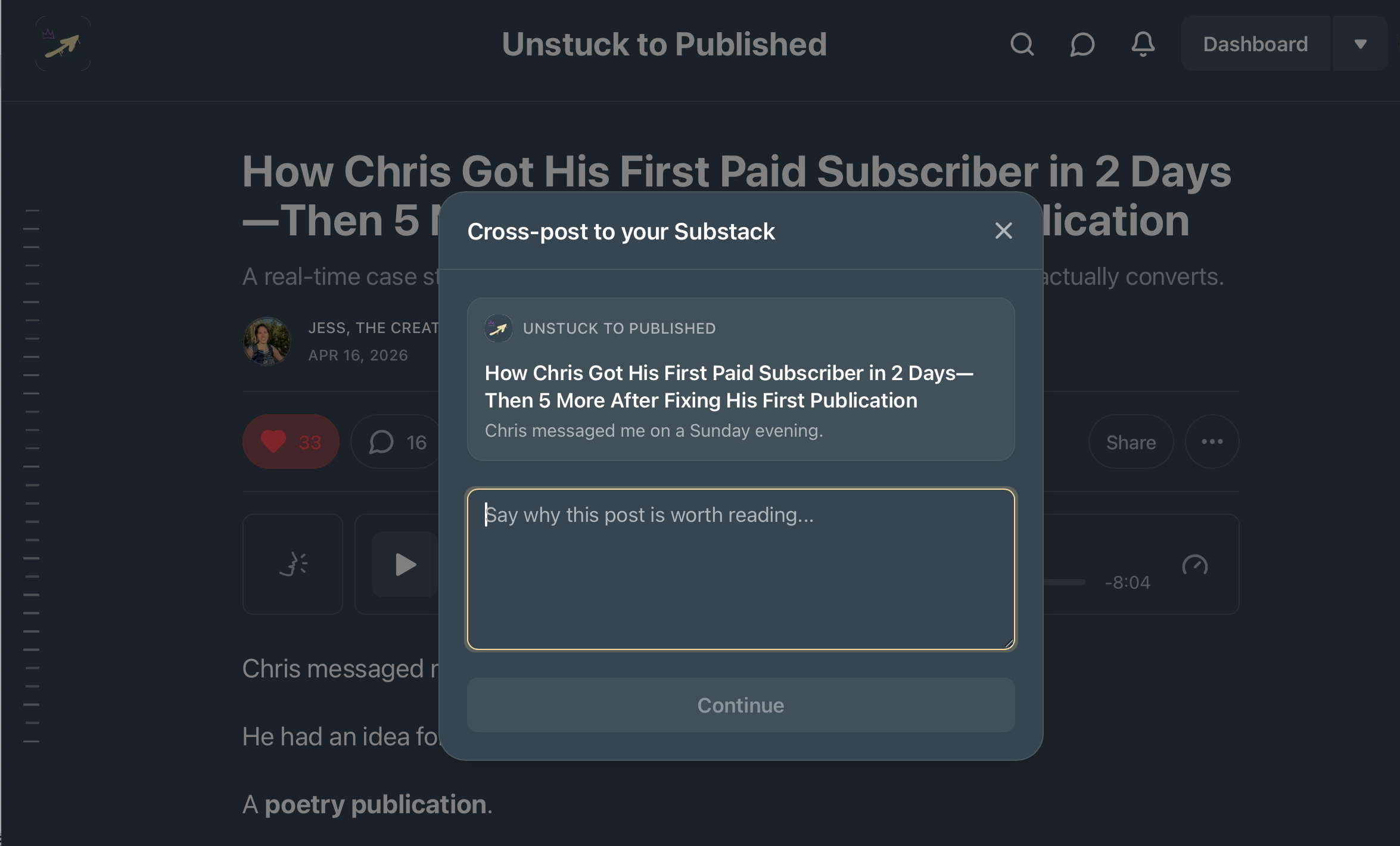 Choose your publication to post it to and who you want to send it to…your free subscribers or paid subscribers, or everyone.