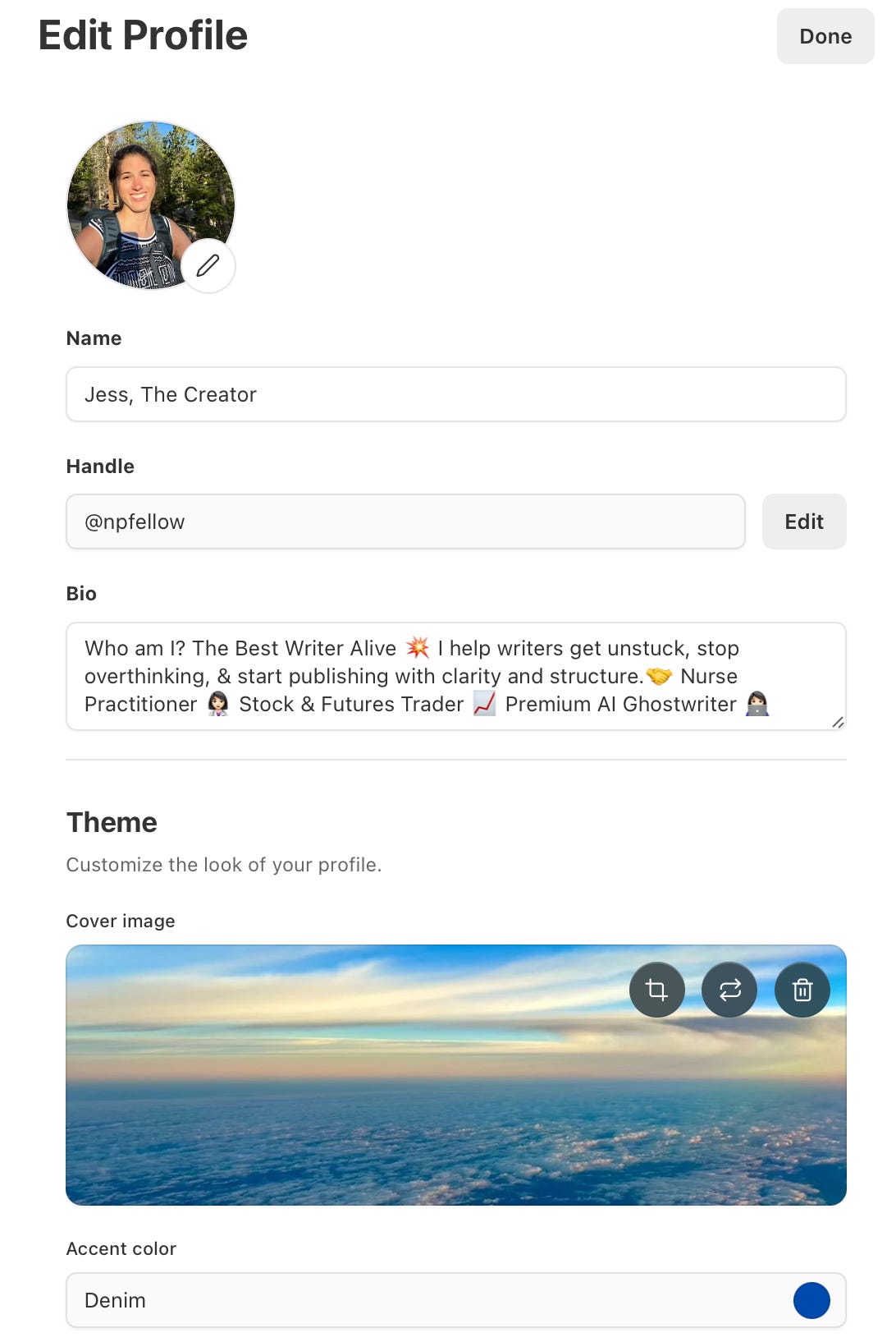 Once you click “Edit profile,” you can change your name, bio, cover image, and, accent color.