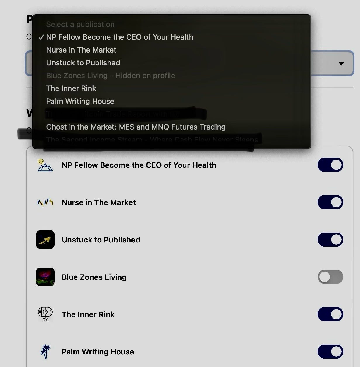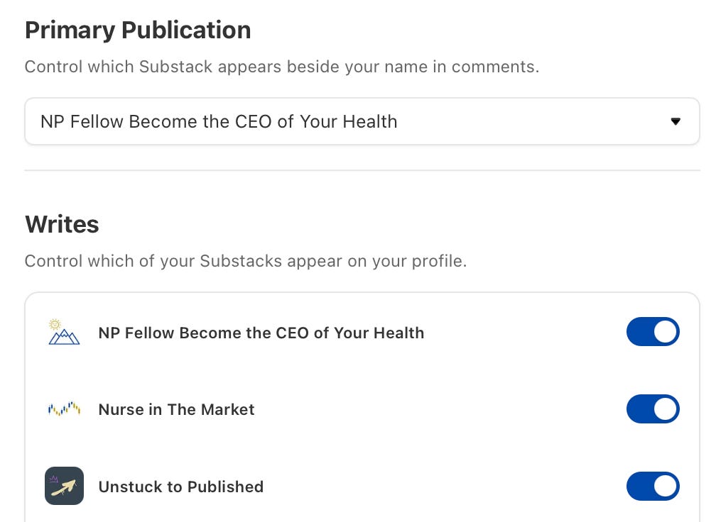Also under “Edit profile,” if you own more than one publication, or ghost write for multiple clients, or work on multiple publications, you can choose which Substack appears beside your name in comments and which Substacks appear on your profile.